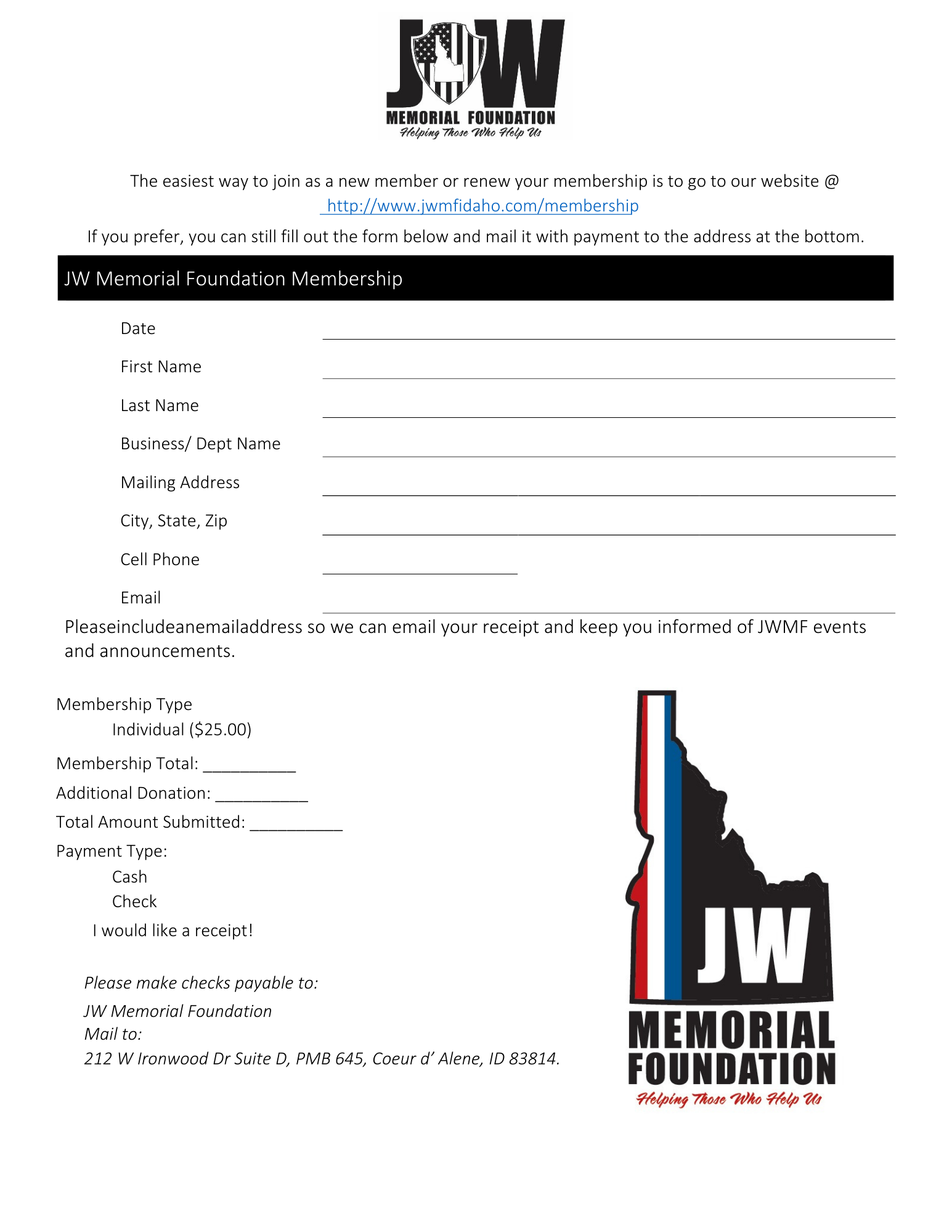 In order to expand our ability to respond to the needs of the families of fallen law enforcement officers, firefighters and EMS professionals, the JW Memorial Foundation has a goal of developing and increasing our membership base.
